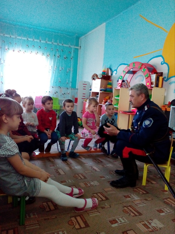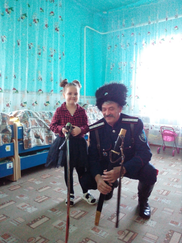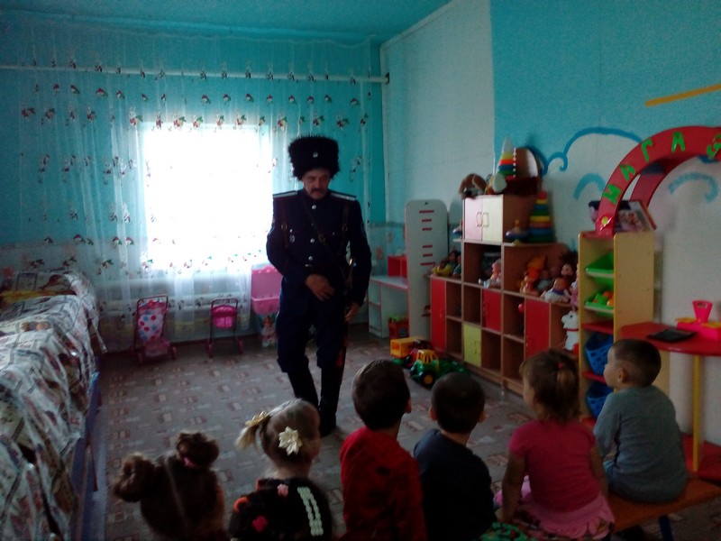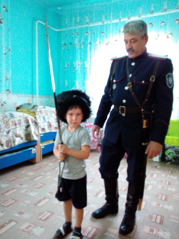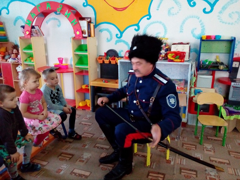 8 ноября к нам в детский сад приезжали гости из ХКО «Тузлов». Атаман ХКО «Тузлов» вахмистр С.Н. Солодилов провел с детьми беседу. Рассказал об истории казачества и показал мундир казака, шашку и нагайку. Беседа для детей была познавательной, интересной и увлекательной.