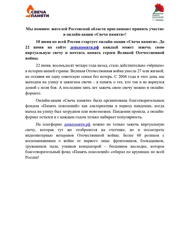 22 июня в Российской Федерации отмечается памятная дата – День памяти и скорби. Одним из ключевых тематических проектов Дня памяти и скорби является Всероссийская онлайн-акция «Свеча памяти» (далее – Акция). Цель Акции - сохранение исторической памяти о Великой Победе нашего народа с помощью вовлечения граждан Российской Федерации в памятные мероприятия, тем самым сохраняя преемственность поколений россиян, чтобы ежегодно вспоминать 27 млн погибших в годы Великой Отечественной войны.